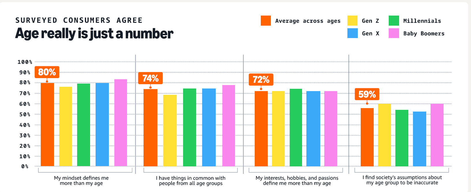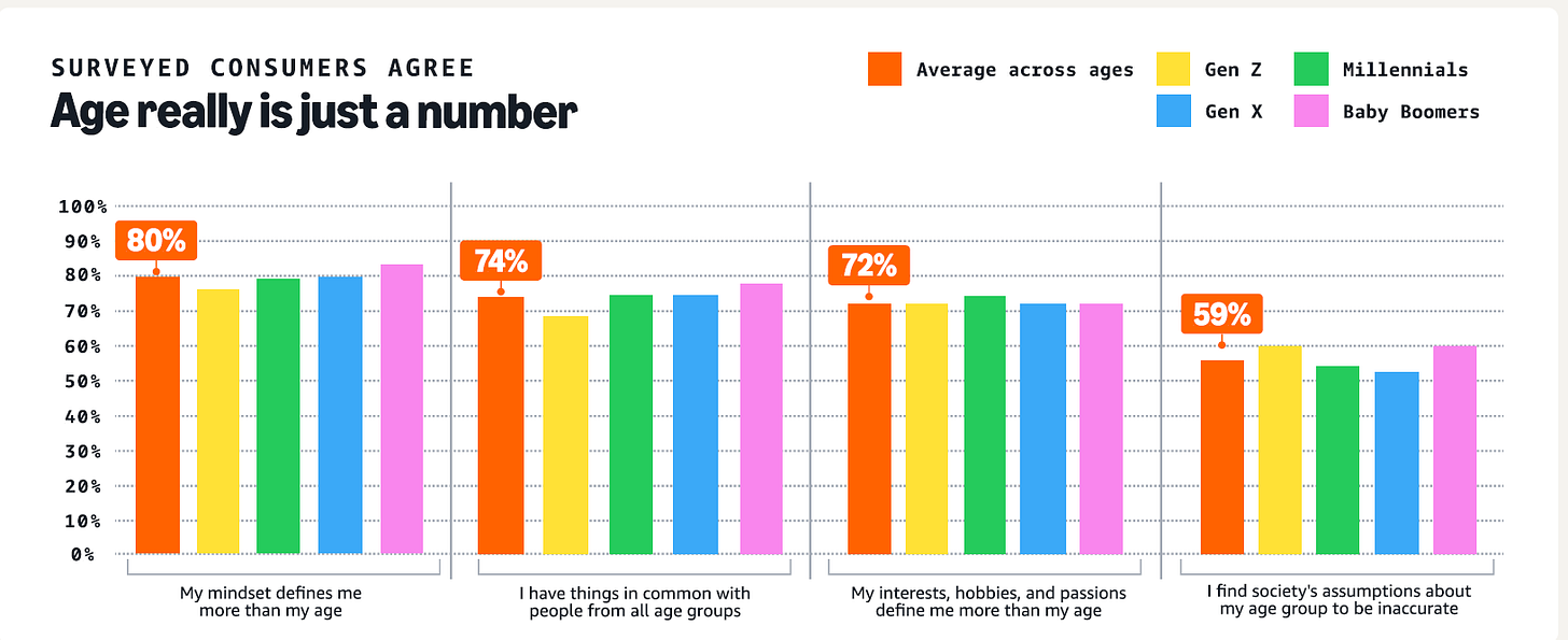 Aún más revelador: 3 de cada 5 personas sienten que existen muchas suposiciones inexactas y estereotipadas sobre su grupo de edad.